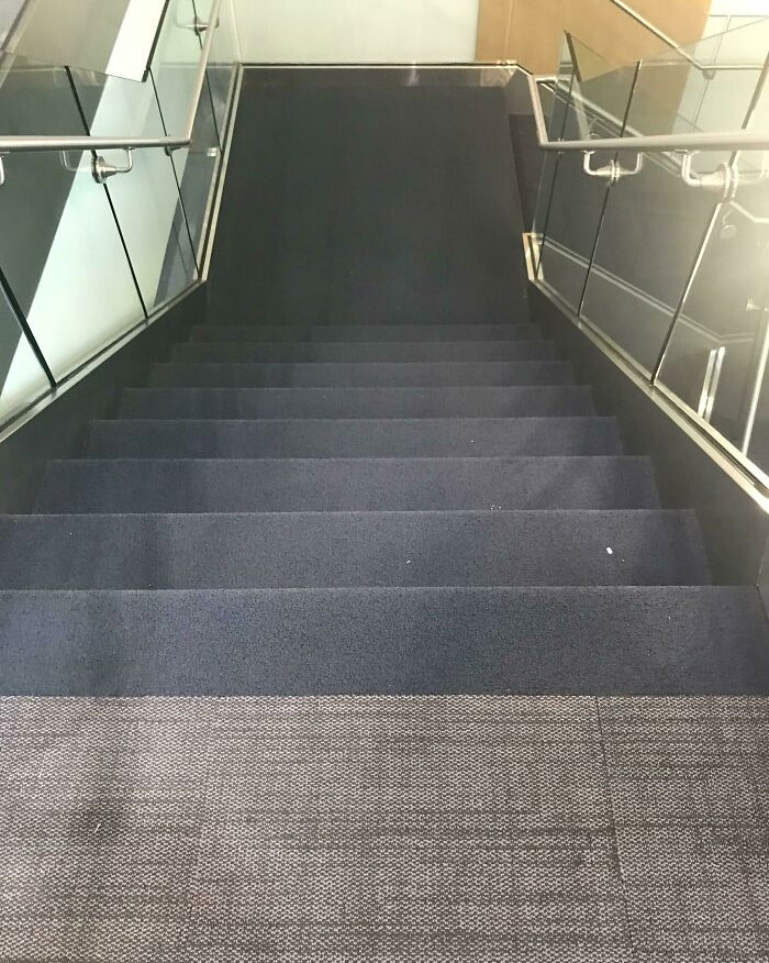 Tieto schody sú pokryté kobercom so vzorom, ktorý sťažuje videnie okraja