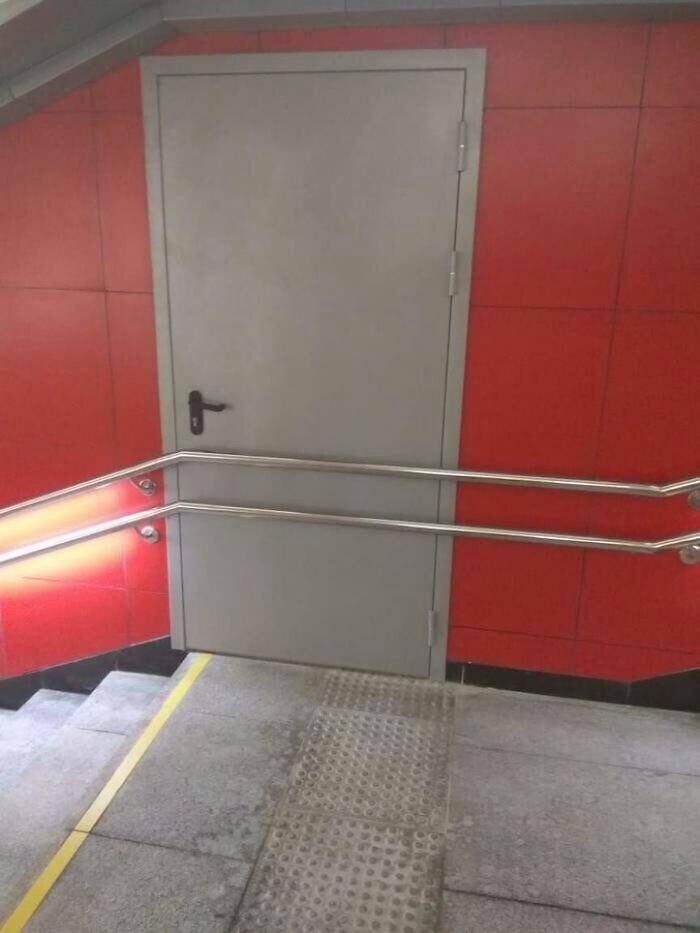 Moja firma práve dala prerobiť schody. Modrá začína na podlahe pred schodmi. Vždy ma to vyvádza z miery