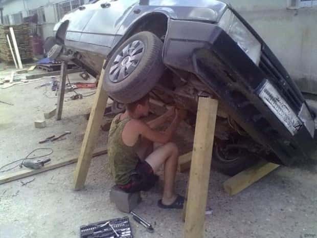 Improvizovaná oprava auta pomocou dreva naznačovala viac odvahy než rozumu.