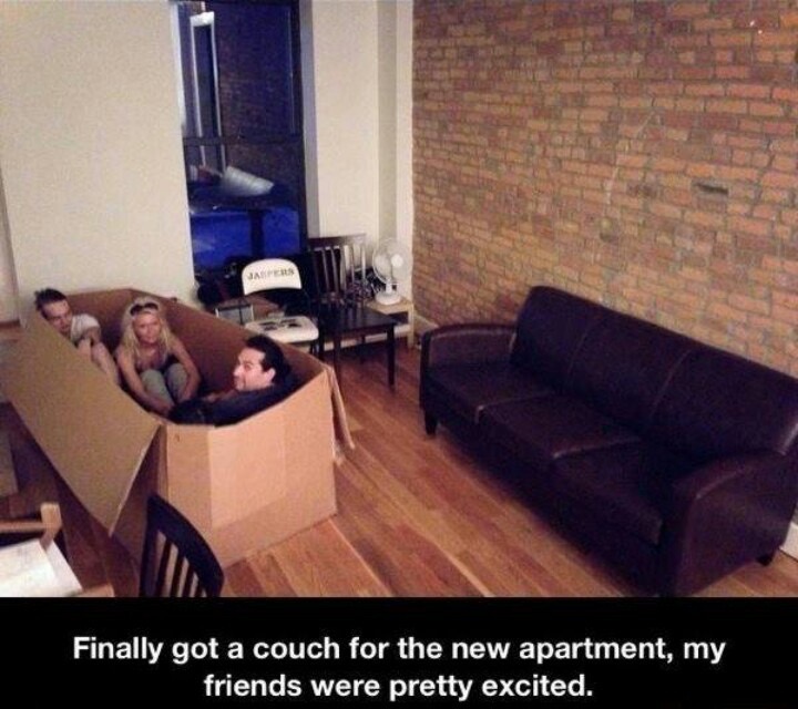 Konečne som do svojho bytu kúpil nový gauč. Moji priatelia sú nadšení!