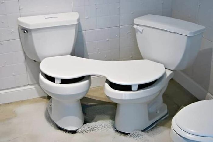 Dve toalety nainštalované vedľa seba so spoločným krytom. Toto je naozaj zvláštne. Navyše hneď vedľa je tretia…
